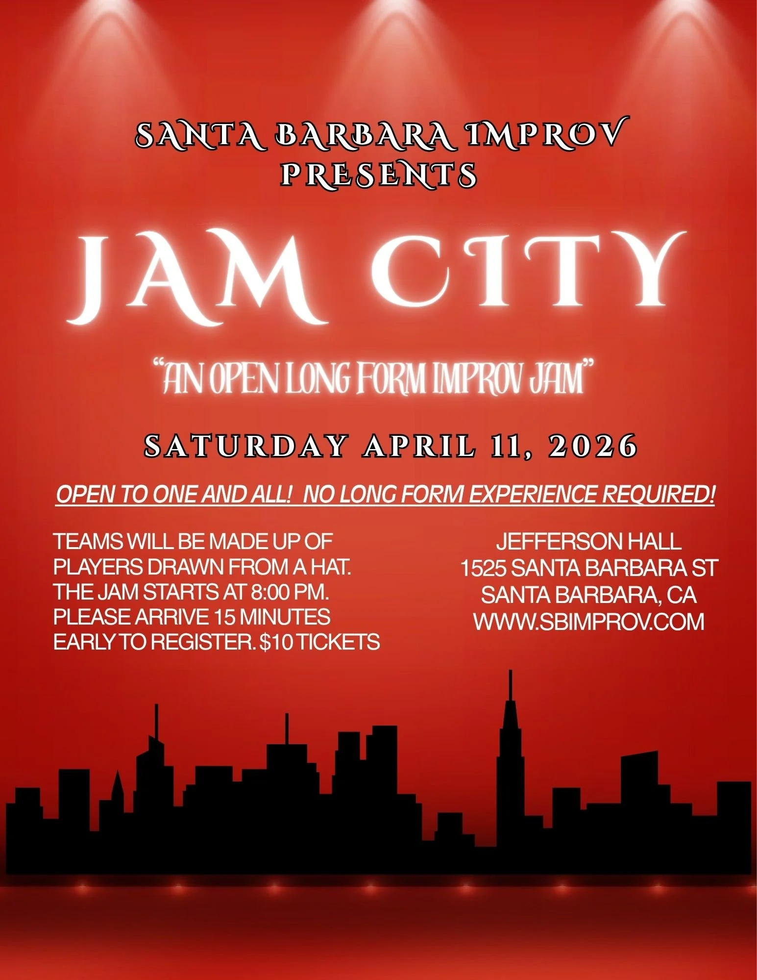 On Saturday, April 11, 2026, Santa Barbara Improv will host "Jam City," a long form improv jam open to everyone regardless of skill level or experience. There will be no established teams. Prospective players will place their names in a hat. Names will then be drawn at random to form teams, with each team having at least one experienced player. The number of people on a team and the length of the set will be determined by the overall number of participants, but it should be around 12-15 minutes per 6 person team. Jam City is an opportunity for people who have little experience in long from to get their feet wet, and it will provide a chance for experienced players to perform with folks from our wider Central Coast improv community.