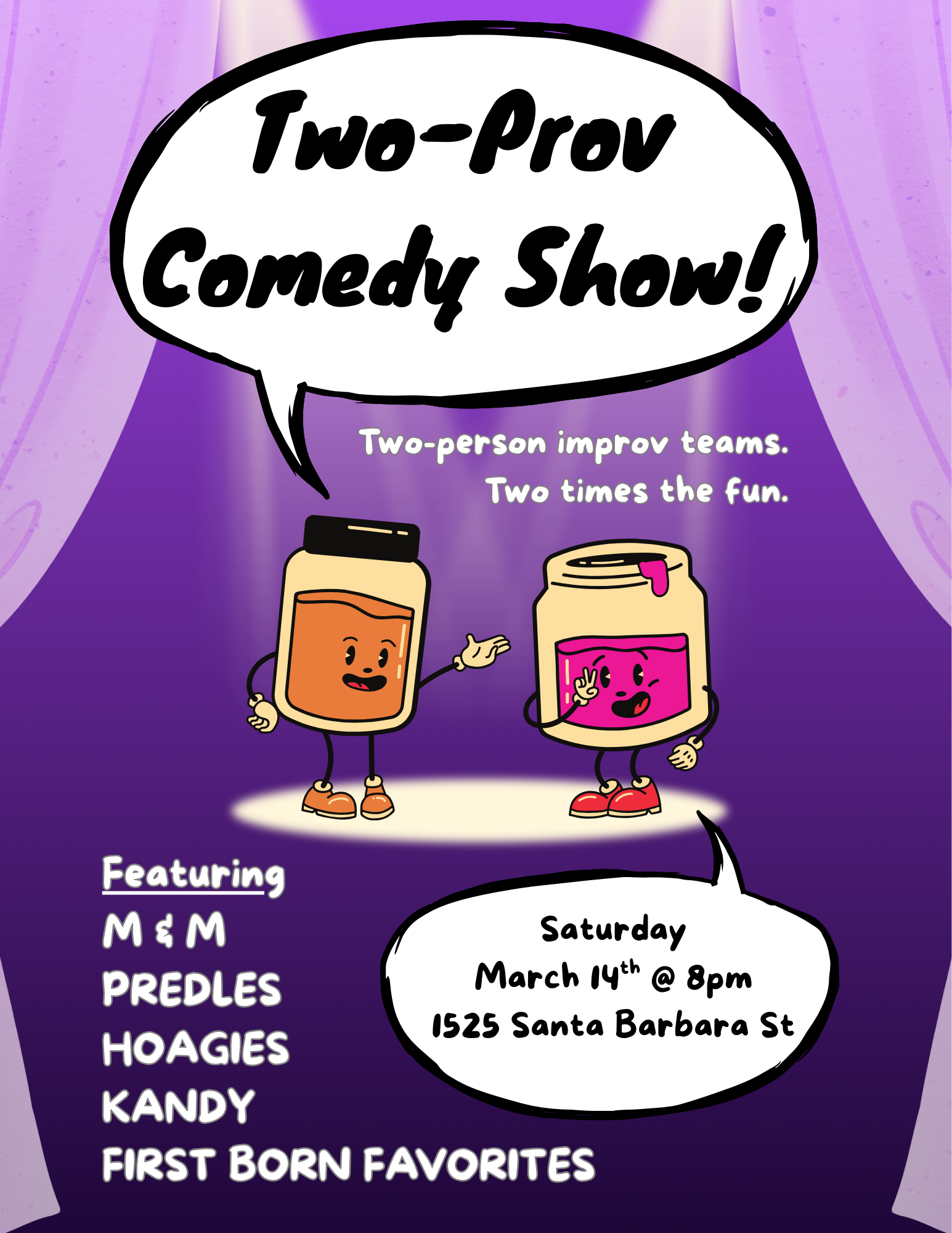 What's Two-Prov? Long Form Teams of two players! Two players get on stage and create a story on the spot based on your suggestions. 2 much fun!